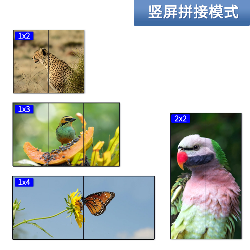 4K竖屏电视机拼接盒支持最大分辨率4K@60Hz HDMI 4:4:4输入, 支持HDCP 2.2。支持任何输入信号路由到4个HDMI输出。用户可以通过遥控器或者面板按键选择不同的拼接模式,比如2×2视频墙模式。支持2-4屏任意拼接模式。